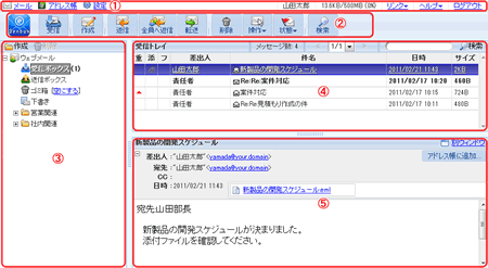 表示されたメールはドラッグ&ドロップで各フォルダに移すことができ、ダブルクリックすることで、参照画面が表示されます。