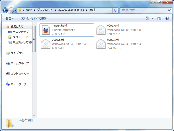 ダウンロードしたZIPファイルを解凍すると、mailディレクトリの下に_index.htmlと選択したメールが.eml形式のファイルとして格納されています。