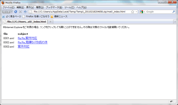 メールファイルは自動生成(連番)されたファイル名になっていますが、_index.htmlファイルをブラウザで開くと、ファイル名とファイル名に対応するメールの件名が表示されます。