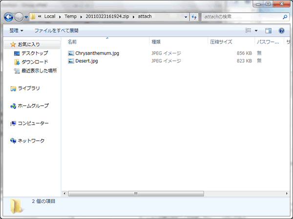 ダウンロードしたZIPファイルを解凍すると、選択したメールの添付ファイルがattachディレクトリに格納されています。