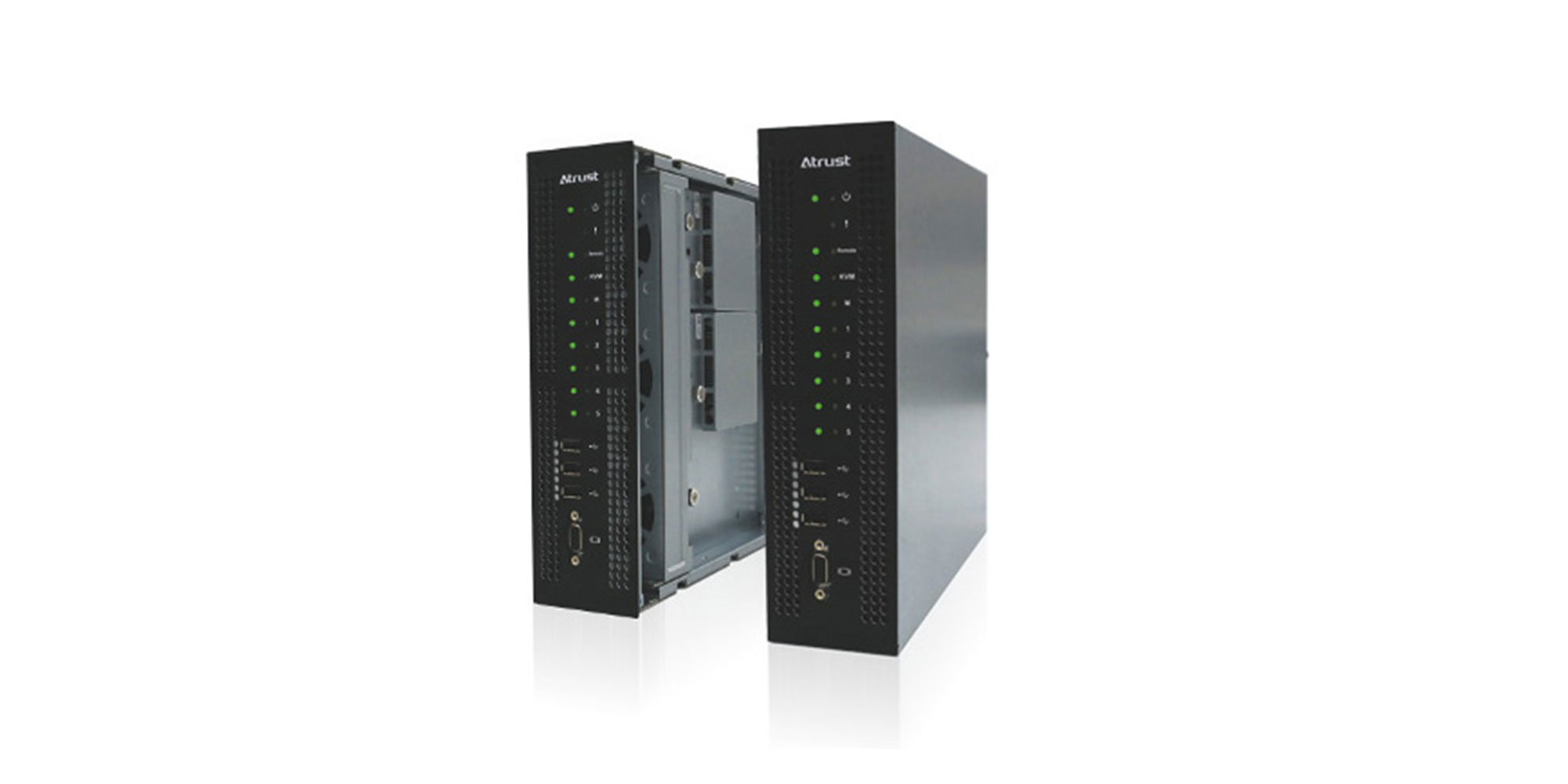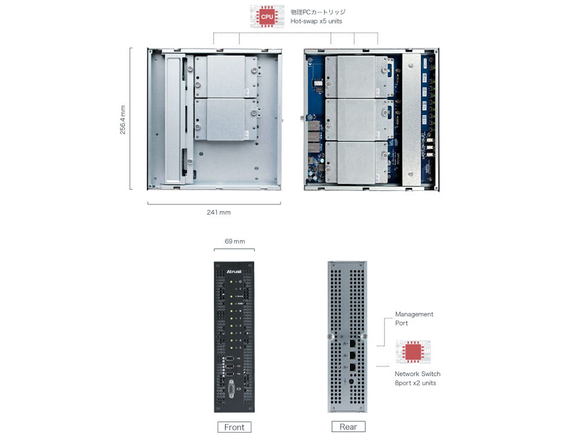 | 内蔵コンポーネント | PCカートリッジ ×5 KVM スイッチ ×1 イーサネット スイッチ ×2 Atrust Chassis Manager(管理コンソール) ×1 ファン ×3 |